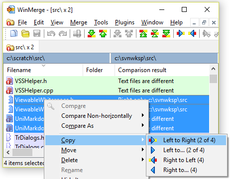 בתפריט WinMerge, → ו- → מתנהגים באותו אופן כמו פקודות ההעתקה של סרגל הכלים.