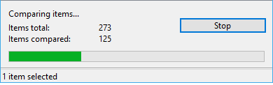 אם פעולת ההשוואה מהירה, ייתכן שלא תשים לב לחלון ההתקדמות, שנסגר ברגע ש-WinMerge מציג את תוצאת השוואת התיקיות. חלון ההתקדמות מציג את מספר הקבצים והתיקיות שיש לכלול בפעולה ואת המספר שהושווה עד כה. סרגל ההתקדמות מייצג גרפית את הפריטים שהושוו.